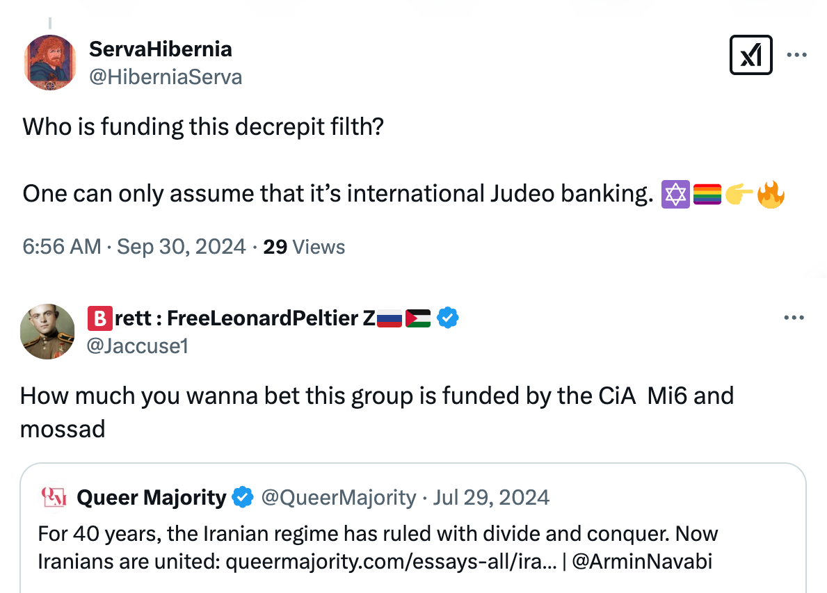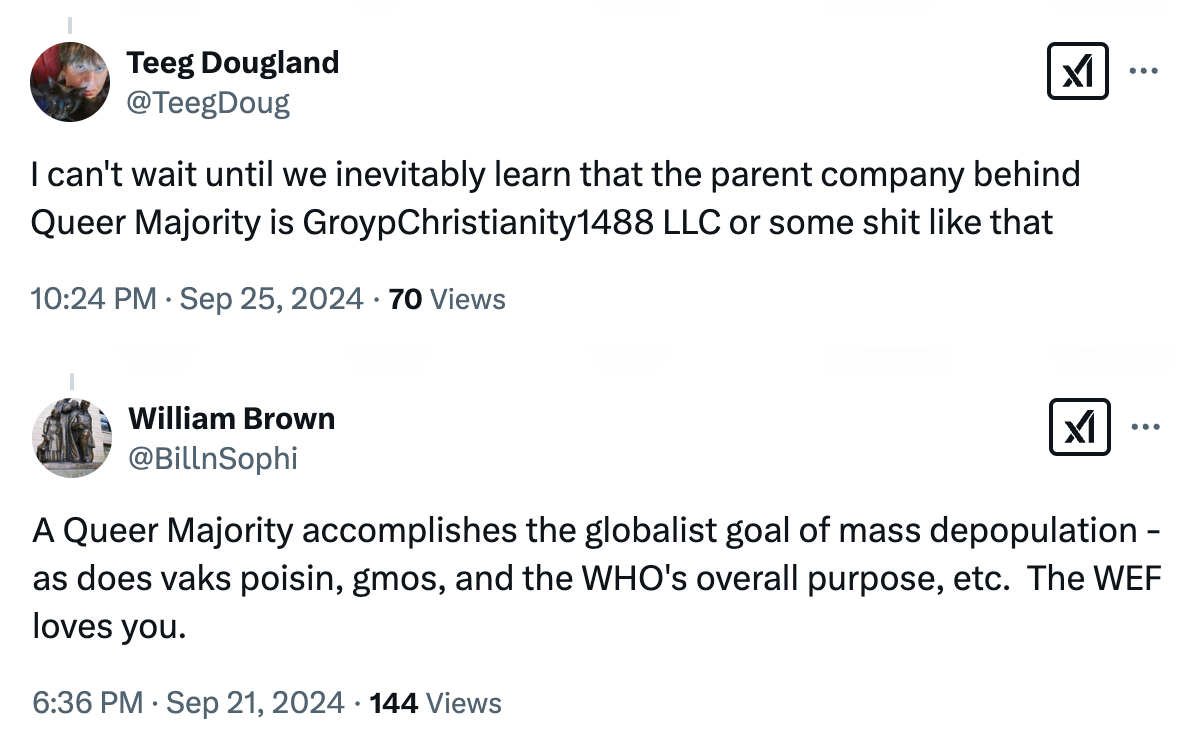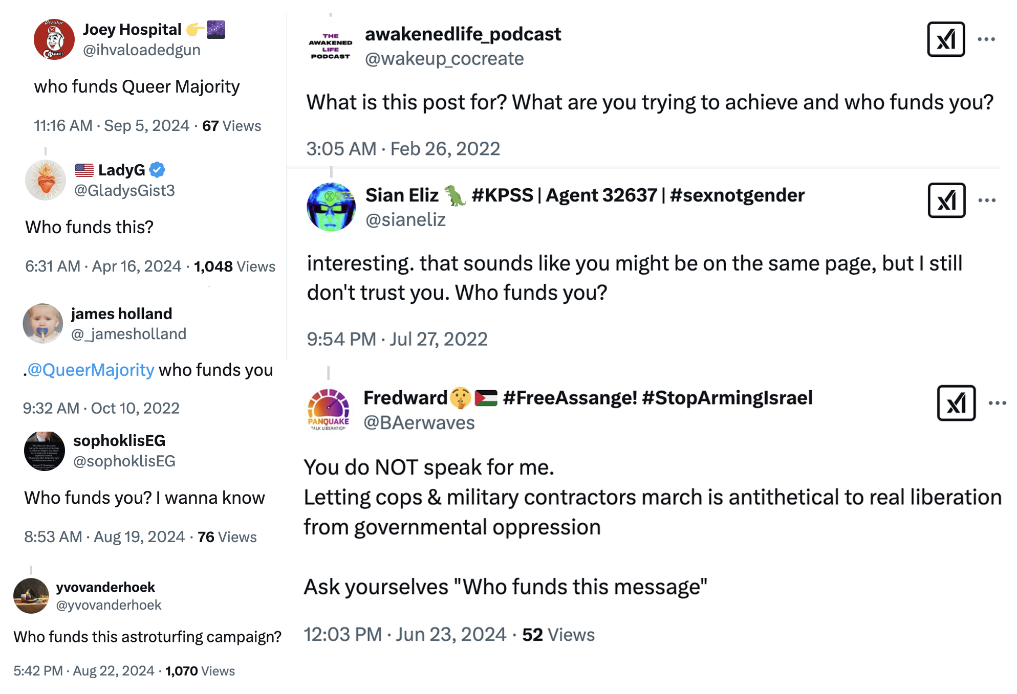 The fascinating thing about QM conspiracy theories is that you can see them take shape in real time. They begin with the sheer preponderance of people who, upon encountering our work and finding that it doesn’t conform to the hard-left messaging they were hoping either to agree with or hate on, immediately ask questions like “Who funds Queer Majority?” Here we can observe the Western-spotted conspiracist in their natural habitat. Notice how the very first reaction to something unexpected causes a moment of uncomfortable dissonance that gives way to knee-jerk suspicion. “A queer publication that isn’t just another Pink News — or Log Cabin Republicans?! Impossible! LGBT people can’t be moderate normies! Something fishy must be going on here!” And, of course, once internet-poisoned warriors for Truth begin to “ask questions”, they begin to “answer” them.