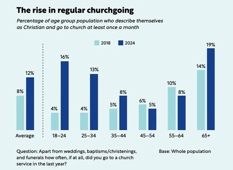 And it turns out we’re not alone. There is some evidence showing that after years of declining church participation and the rise of the “nones” — those who mark “none” for their religion in surveys — the trend has slowed or even slightly reversed. Gen Z may actually be heading back to church, albeit not in significant numbers. In the UK, reports of a “Quiet Revival” have found that young men especially, are finding their way to church.