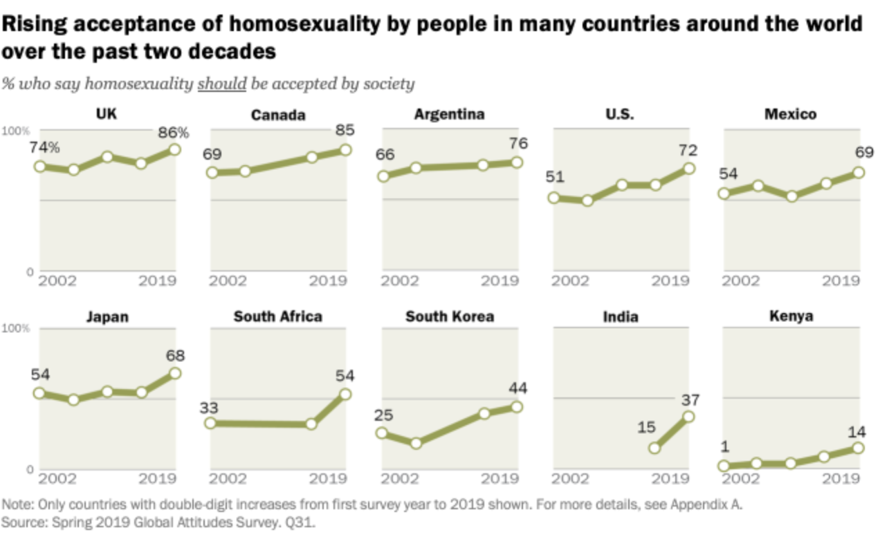 O gráfico mostra as taxas crescentes de aceitação da homossexualidade por pessoas em vários países ao redor do mundo. Fonte: Pew Research